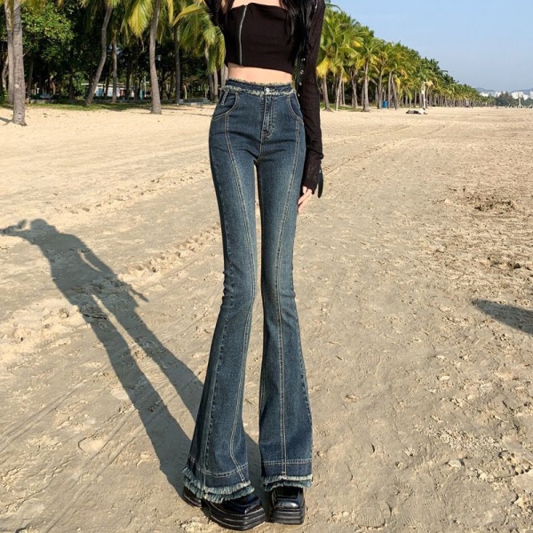 复古毛边微喇叭牛仔裤女春装2023新款高腰弹力马蹄裤拖地喇叭裤子