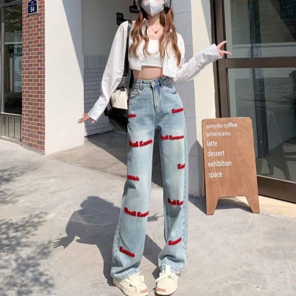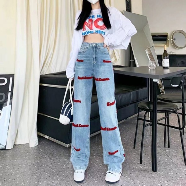 字母刺绣牛仔裤女春秋新款高腰显瘦设计感小众美式复古直筒阔腿裤