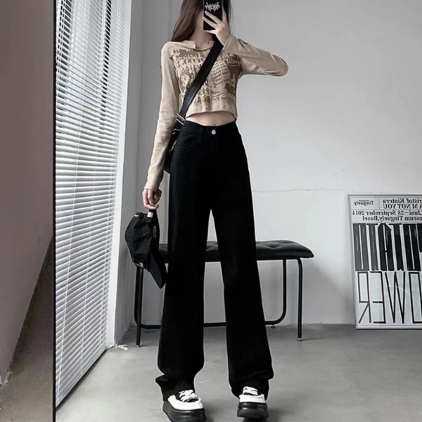 黑灰色阔腿牛仔裤女春秋季2023年新款高腰小个子宽松直筒拖地裤子